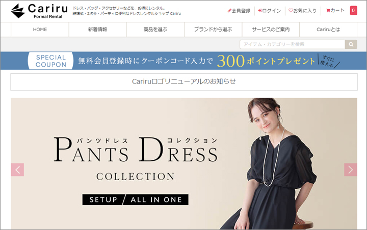 Cariruは、株式会社トレジャー・ファクトリーが運営するレンタルドレス専門サイトで、4,000点以上のフォーマルアイテムを取り揃えるレンタルサイトです。